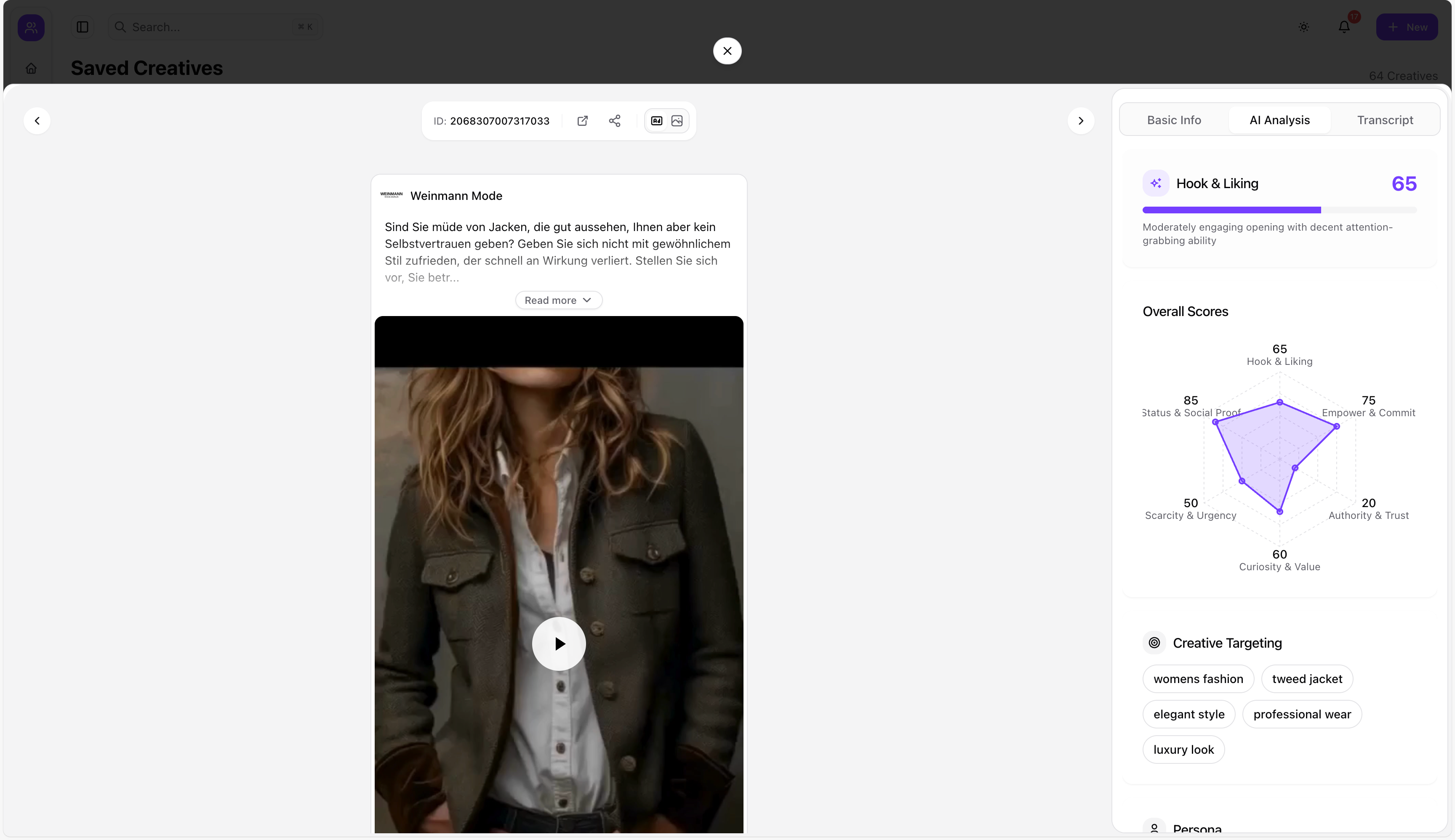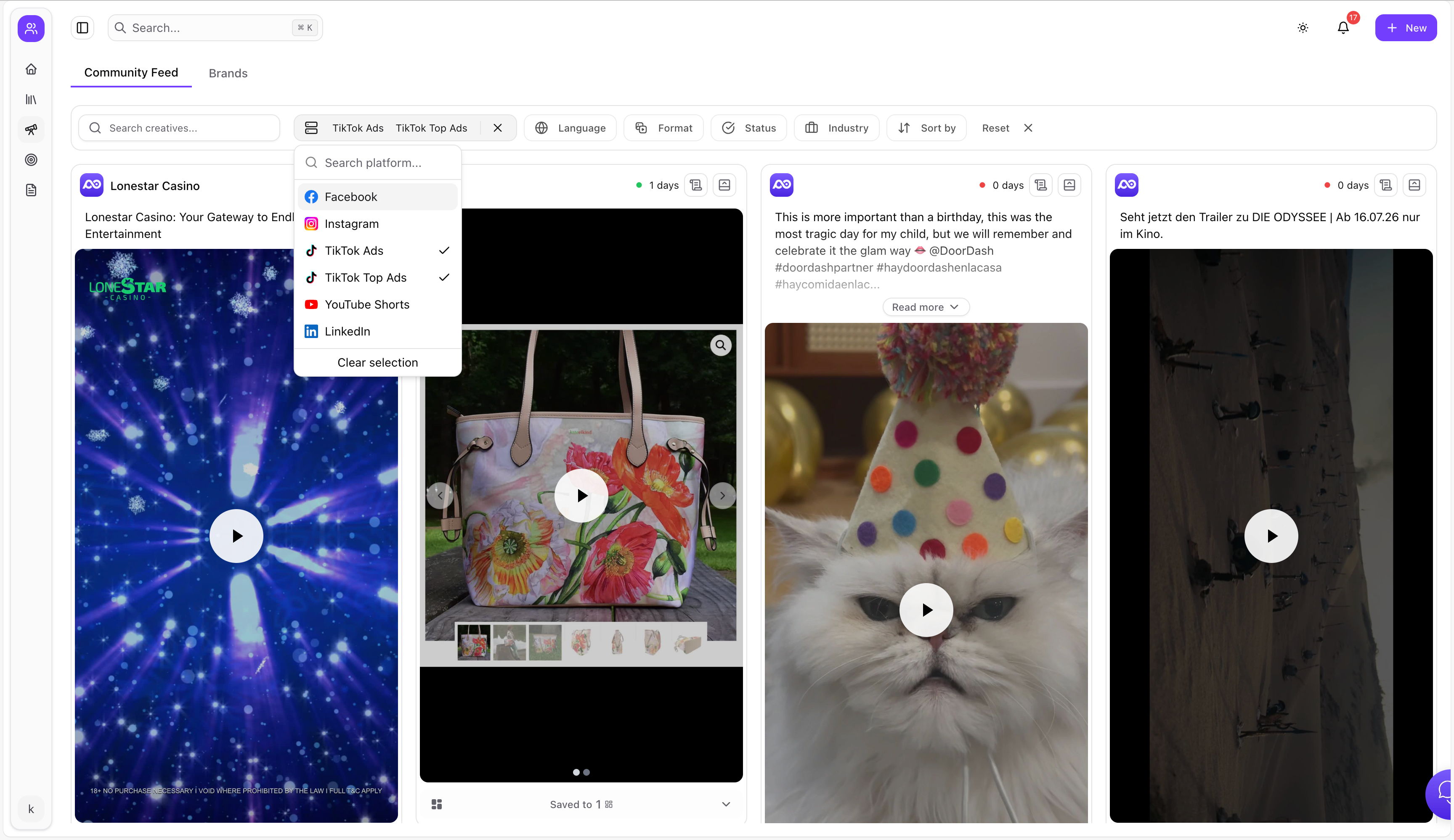 Use Adlude Discovery to browse ads from TikTok, Facebook, YouTube Shorts, LinkedIn and more—then filter by keyword, platform, language, format, and industry. It supports AI scoring and video transcription so you can extract hooks faster.