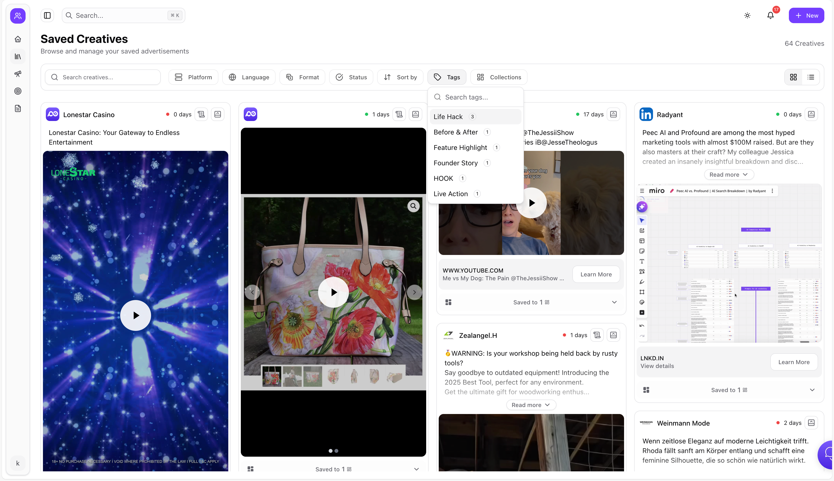 Save them into a system that captures the creative and metadata, then organize them with folders/tags. Adlude Ad Saver + Swipe File is built for that.